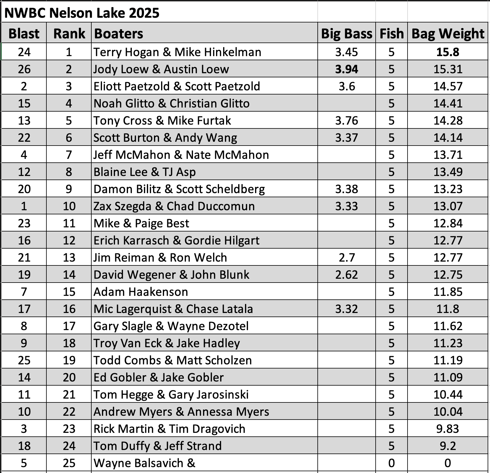 Well… we love Nelson 9 sacs. Can never seem to find the bigs on tourney day on this lake. 2.09# was our biggest.